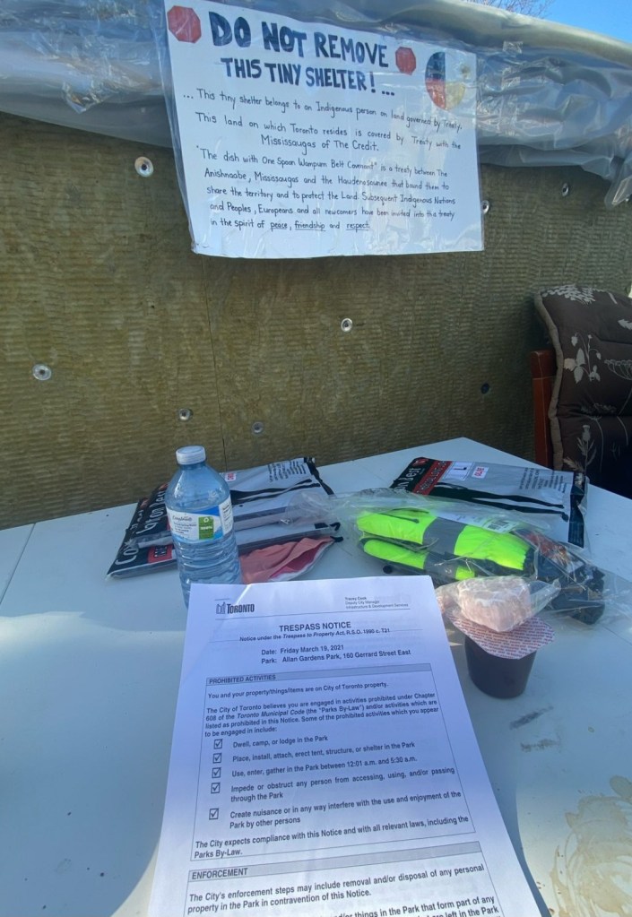 The City claims that Pathway Inside will clear four priority parks; however, Allan Gardens has also been served with a trespass notice (photo below).